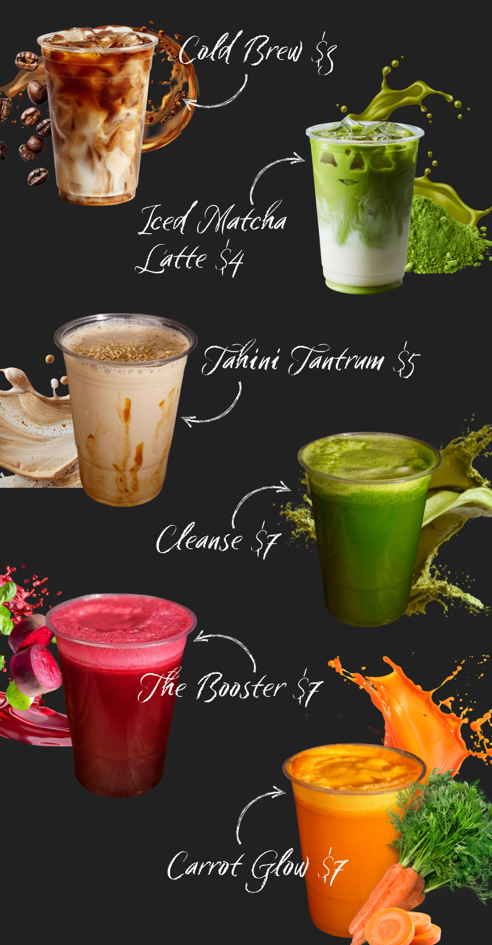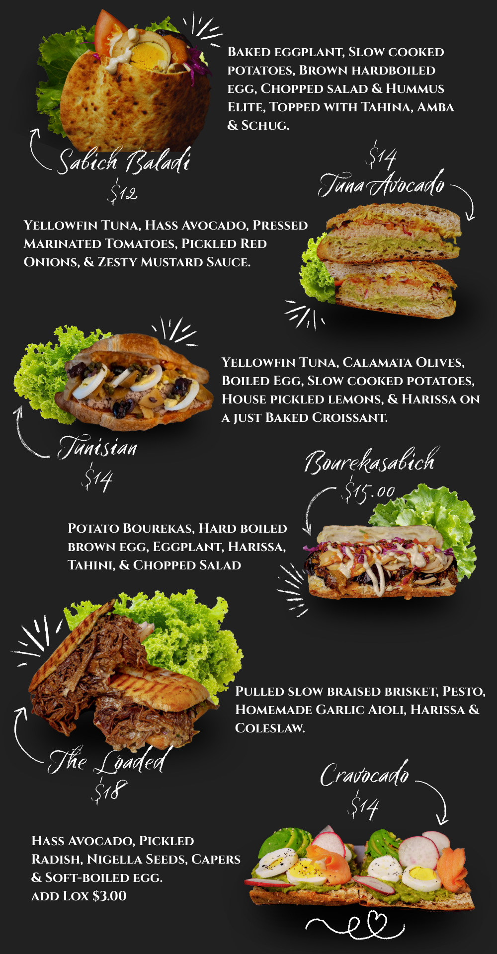 For lighter options, enjoy the richness of Tuna Avocado or the vibrant Mediterranean flair of Sabich Baladi. Complement any meal with a refreshing selection from our Juice Bar, pressed fresh to order for the perfect balance of flavor and nourishment.
