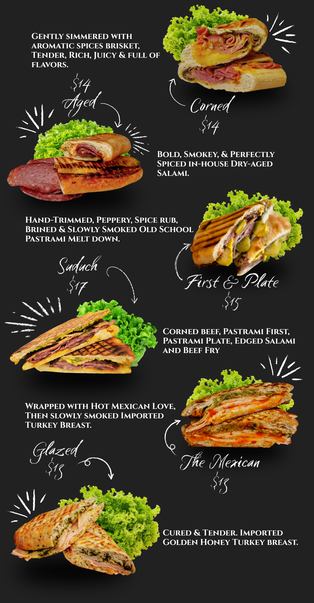Welcome to a fresh take on classic deli favorites, where every bite is crafted with care and tradition. Our Mediterranean Pressed Sandwiches feature premium ingredients layered on artisan breads, each one made to highlight bold flavors and quality cuts. From tender Corned Beef and Pulled Brisket to savory Aged Salami, Honey Turkey Breast, and Pastrami, every sandwich is a celebration of taste and texture.